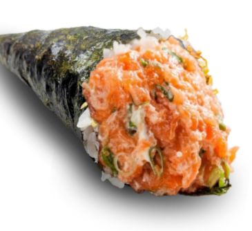 salmão picado, maionese, sriracha e cebolinha.